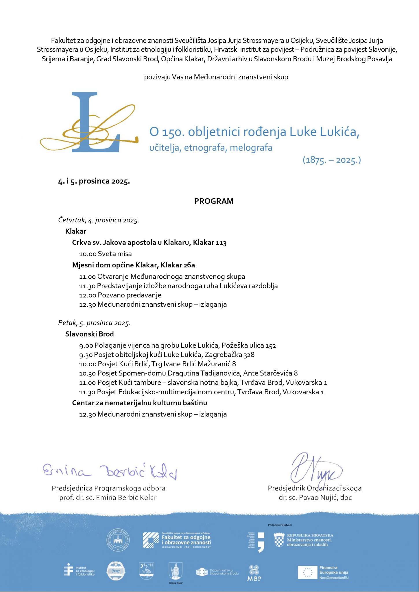 Fakultet za odgojne i obrazovne znanosti/Faculty of Education Osijek, Sveučilište Josipa Jurja Strossmayera u Osijeku, Institut za etnologiju i folkloristiku, Hrvatski institut za povijest – Podružnica Slavonski Brod, Grad Slavonski Brod, službena stranica, Općina Klakar, Državni arhiv u Slavonskom Brodu-DASB i Muzej Brodskog Posavlja, uz pokroviteljstvo Ministarstvo kulture i medija Republike Hrvatske i Ministarstva znanosti, obrazovanja i mladih Republike Hrvatske, organiziraju Međunarodni znanstveni skup „O 150. obljetnici rođenja Luke Lukića, učitelja, etnografa, melografa (1875. – 2025.)”. Skup će se održati 4. i 5. prosinca 2025. u Klakaru i Slavonskom Brodu.