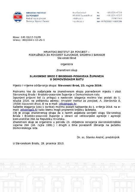 Podružnica za povijest Slavonije, Srijema i Baranje Hrvatskog instituta za povijest organizira u Slavonskom Brodu, 23. rujna 2016. Znanstveni skup „Slavonski Brod i Brodsko-posavska županija u Domovinskom ratu”
