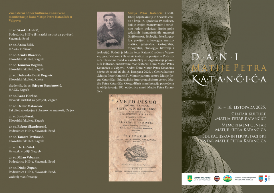Matija Petar Katančić (1750-1825) najistaknutiji je hrvatski erudit s kraja 18. i početka 19. stoljeća koji je svojim znanstvenim i stručnim radom pokrivao široko polje tadašnjih humanističkih znanosti. Grad Valpovo i Hrvatski institut za povijest – Podružnica Slavonski Brod u zajedničkoj organizaciji već sedmu godinu zaredom organiziraju kulturno-znanstvenu manifestaciju Dani Matije Petra Katančića. Sedmi Katančićevi dani počinju 16. listopada (četvrtak) u 11 sati u Centru kulture Matija Petar Katančić s plenarnim izlaganjima dr. sc. Dinka Šokčevića i dr. sc. Roberta Skenderovića. Oni će valpovačku publiku upoznati s Katančićevim djelovanjem u Budimu i Pešti krajem 18. i početkom 19. stoljeća. Ovogodišnja manifestacija nastavak je obilježavanja 200. obljetnice smrti Matije Petra Katančića i osmišljena je kao višednevni znanstveni skup s nizom izlaganja istaknutih znanstvenika. Izlaganja će se održavati u Memorijalnom i Edukacijskom centru Matije Petra Katančića na Trgu kralja Tomislava 12 i 14. Subota je predviđena za održavanje prijepodnevnog sajma knjiga, a manifestacija završava sa subotnjim večernjim koncertom Tria SERAPHIM u kapeli valpovačkog dvorca.